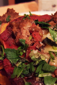 - Assemble with squash round on the bottom, beef layered above, with cilantro or other toppings